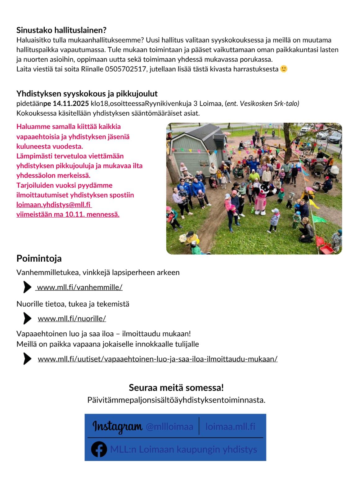 MLL Loimaan kaupungin yhdistyksen jäsenenä tuet tärkeää vapaaehtoistyötämme loimaalaisten lasten, nuorten ja perheiden hyväksi. Jäsenenä saat käyttöösi paikalliset ja valtakunnalliset jäsenedut, majoitut edullisesti Ikaalisten kylpylän lomahuoneistossa ja saat neljä kertaa vuodessa ilmestyvän Lapsemme -lehden.